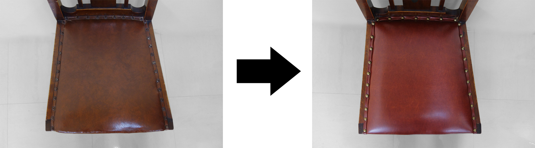 木製オールドチェアの張替 ビフォーアフター 作業内容は張地張替とクッション材の交換、鋲の交換です。 張地の深みのあるブラウンカラーが木部の雰囲気とよく調和し、アンティーク感を出した仕上がりになっています。 鋲の交換 座面の縁は、飾り鋲で張地をしっかりと固定しています。真鍮風の鋲がシートのブラウンカラーとよく調和し、アクセントになっています。