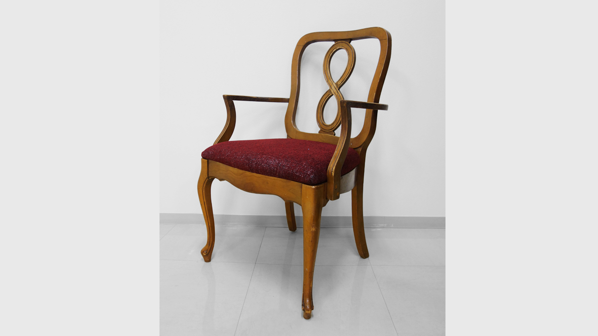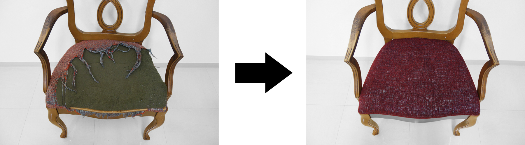 張地が破れ下地が見える状態になっていたアームチェアの座面を赤系の織り生地に張替えました。落ち着いた色合いが木部の色ともよく合い、クラシックなデザインの魅力が引き立てています。