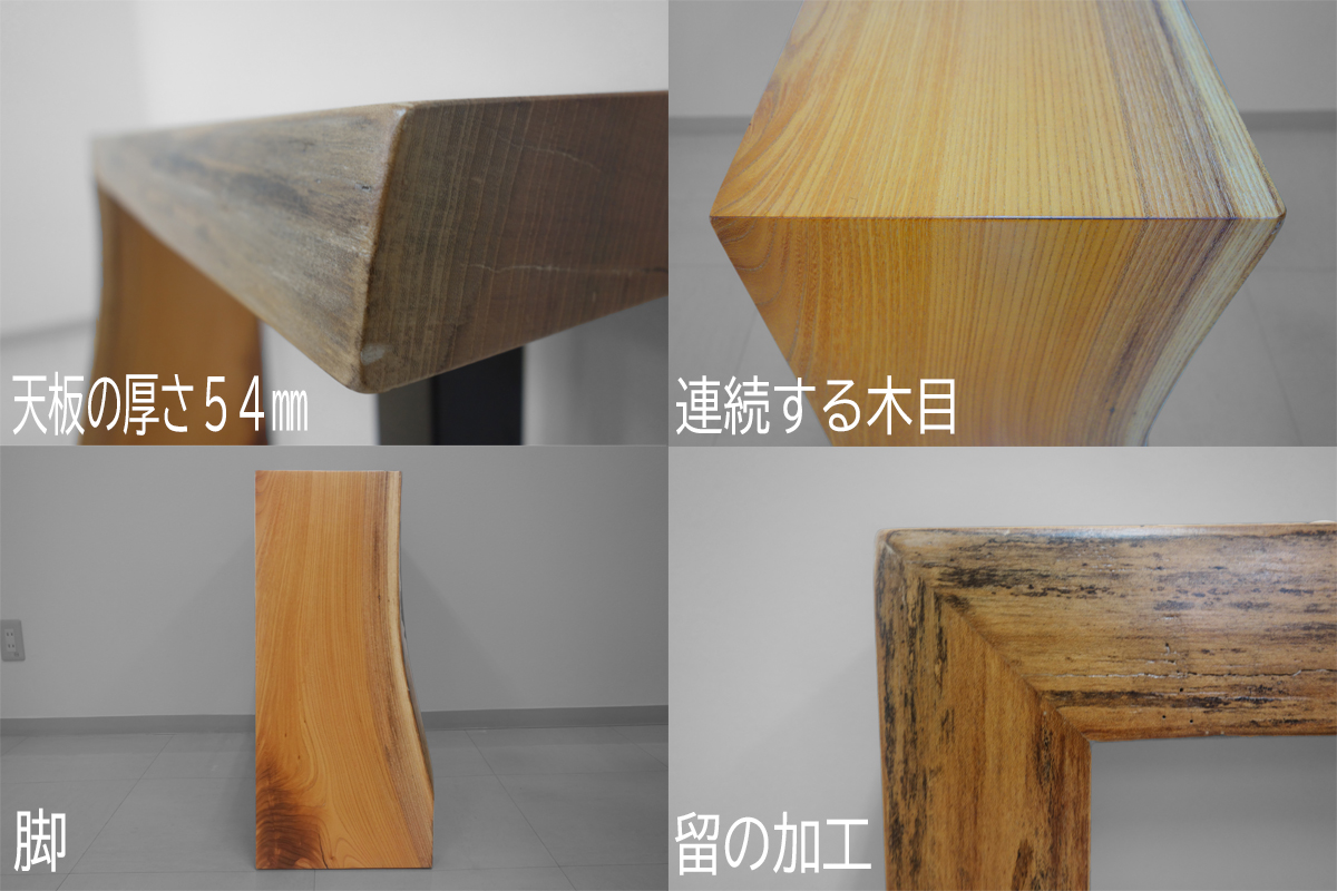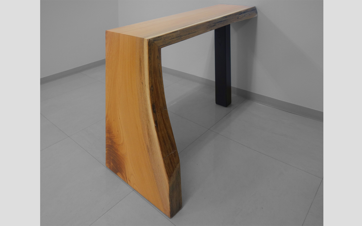 綺麗な木目に惑わされ、用途を決めずに仕入れた欅の板、数日眺めてこのデザインになりました。欅無垢が放つ存在感を大切にしながらも、板を90度に折り曲げたように見せることで、シンプルな中にも遊び心をプラスしています。本格的なデスクとしては小ぶりですが、スマホや飲み物を置いてメモ書きするなど、サイドテーブル的に使うと便利です。高さは敢えて680mmとしました。机としては低めですが、落着く高さです。また、玄関やリビングに置いて家族の写真や思い出の品を飾る台としても使える、2ウェイ仕様です。仕上げはウレタン塗装で、汚れがつきにくくお手入れも簡単です。